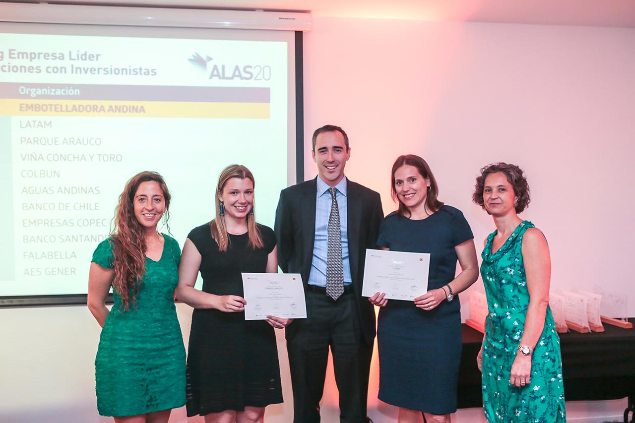 El promedio en la categoría Empresa Líder en Relaciones con Inversionistas obtenido por las once empresas calificadas es de 54 puntos, en una escala de 0 a 100 puntos. Embotelladora Andina y Latam lideran el ranking y le siguen Colbun, Parque Arauco, Viña Concha y Toro, todos con puntajes avanzados (mayor a 59 puntos). Después Aguas Andinas y Banco de Chile obtuvieron un puntaje robusto (entre 50 y 59 puntos) mientras que las restantes tuvieron un puntaje limitado (entre 30 y 49 puntos). En esta categoría las prácticas compartidas por la mayor parte de las empresas evaluadas son la disposición de herramientas e información en inglés de la empresa para los inversionistas -criterio en el cual las empresas evaluadas cumplieron en gran parte de los ámbitos-, presentan un equipo encargado de la relaciones con los inversionistas, son transparentes en comunicar los elementos de su gobierno corporativo y el contexto de sus mercados, además de disponer de herramientas para promocionar estrategias de responsabilidad social corporativa y eventos corporativos. Sin embargo, existen oportunidades de mejora en la disposición de herramientas de comunicación transparente con sus accionistas, y en la entrega de detalles de indicadores cuantitativos y metas de desempeño en el área financiera y de sustentabilidad.