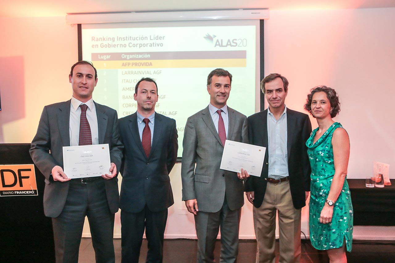 El puntaje promedio que obtuvieron las once instituciones evaluadas en la categoría Institución Líder en Gobierno Corporativo fue de 23 puntos. AFP Provida, Larrainvial AGF e Itau Chile AGF lograron un desempeño limitado (entre 30 y 49 puntos), mientras que las otras ocho obtuvieron puntajes débiles (inferior a 30). Respecto del análisis de la composición y de las reglas del funcionamiento del directorio, el puntaje promedio fue el más alto de las dimensiones evaluadas con 37,5 puntos. Aquí, Larrainvial AGF lidera el ranking con un puntaje avanzado (mayor a 59 puntos), seguido por AFP Provida con un puntaje robusto (entre 50 y 59 puntos). Solamente dos instituciones obtiene puntajes débiles en este ámbito. En el caso de los sistemas de auditoría y controles internos implementados, el puntaje promedio obtenido por las instituciones evaluadas fue de 20,4 puntos, siendo AFP Provida la que sobresale con un puntaje robusto. Dos instituciones obtuvieron un puntaje limitado y ocho un puntaje débil. La información disponible sobre el gobierno corporativo de las instituciones evaluadas es muy escasa en los ámbitos referidos a las reglas que rigen los sistemas de remuneración de los altos ejecutivos, siendo el puntaje promedio logrado de sólo 5,3 puntos, en donde varias empresas obtuvieron un puntaje de 0 puntos.